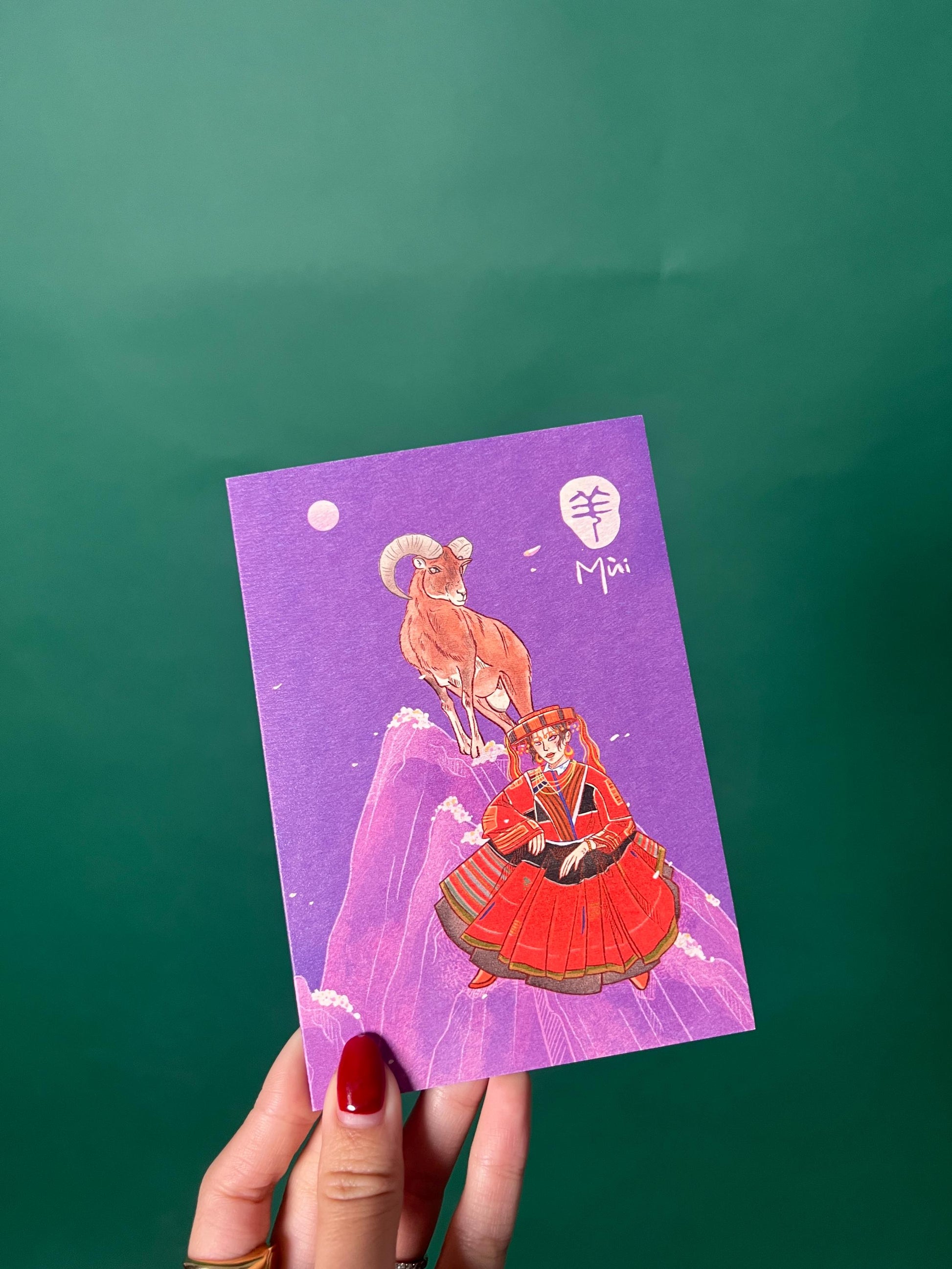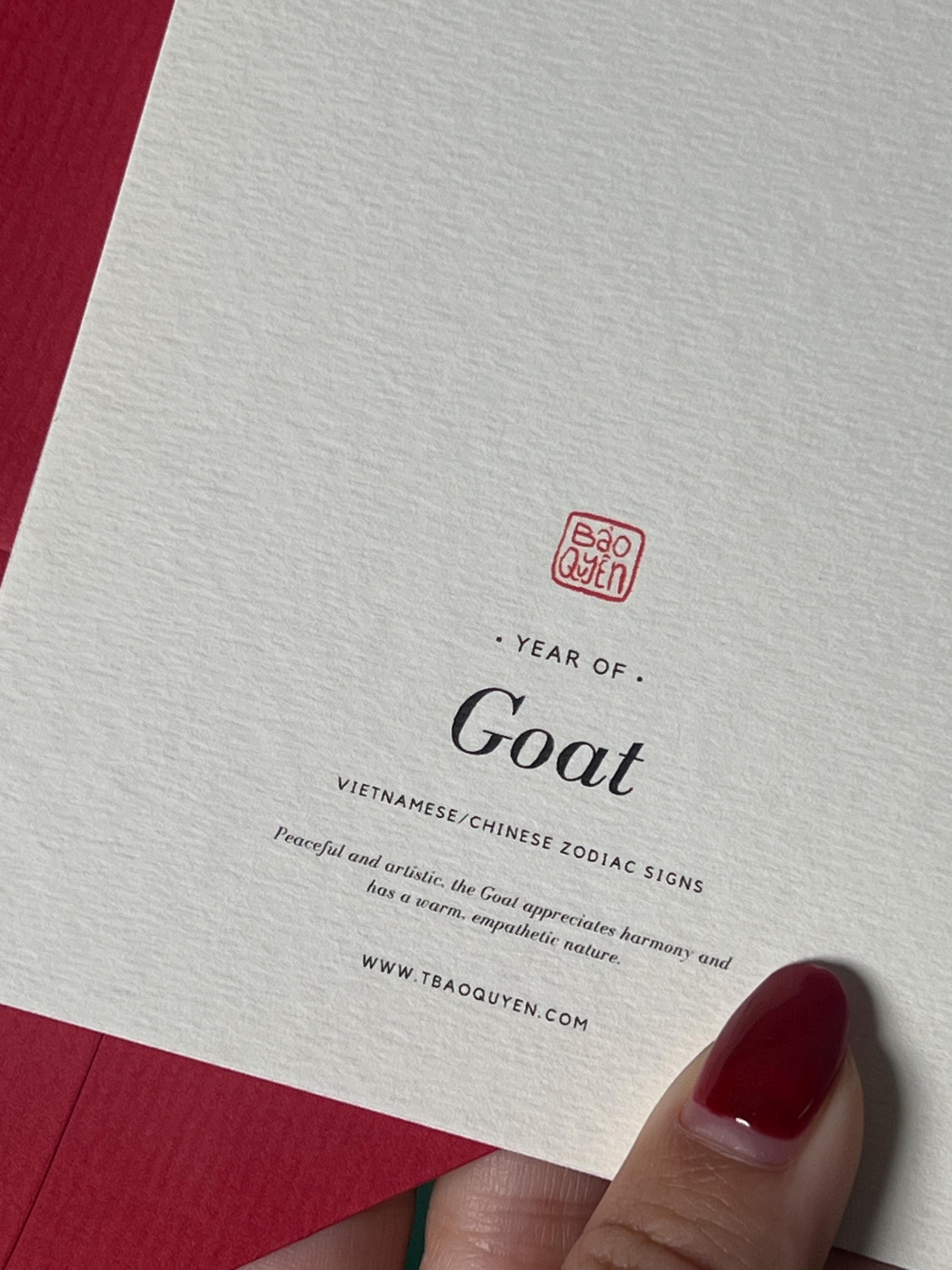 This Goat zodiac greeting card is an original illustration by Bao Quyen, printed on high-quality 320g textured paper. The card is A6 size when folded and comes with a premium, colourful textured envelope, making it perfect for gifting or keeping as a meaningful keepsake.