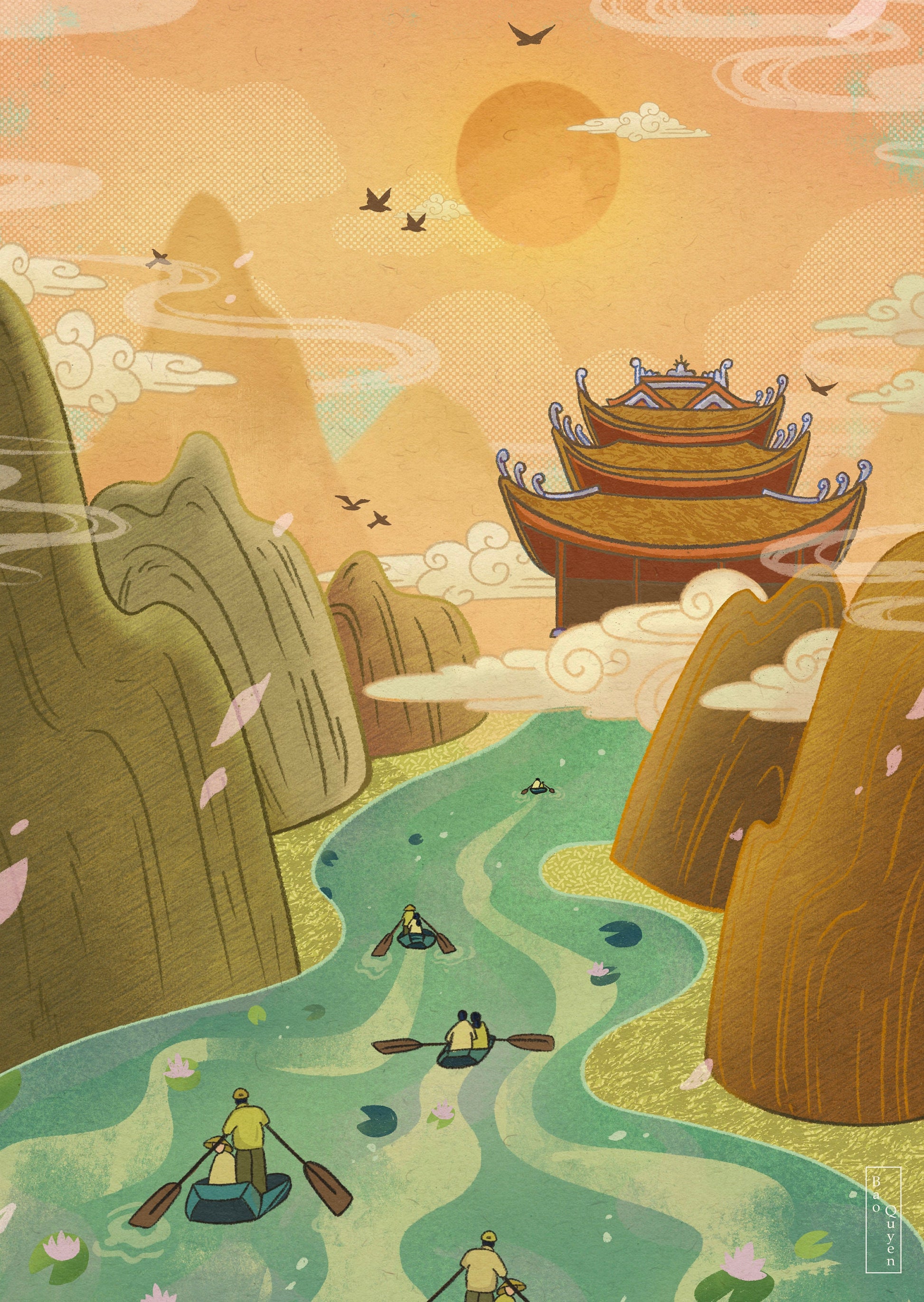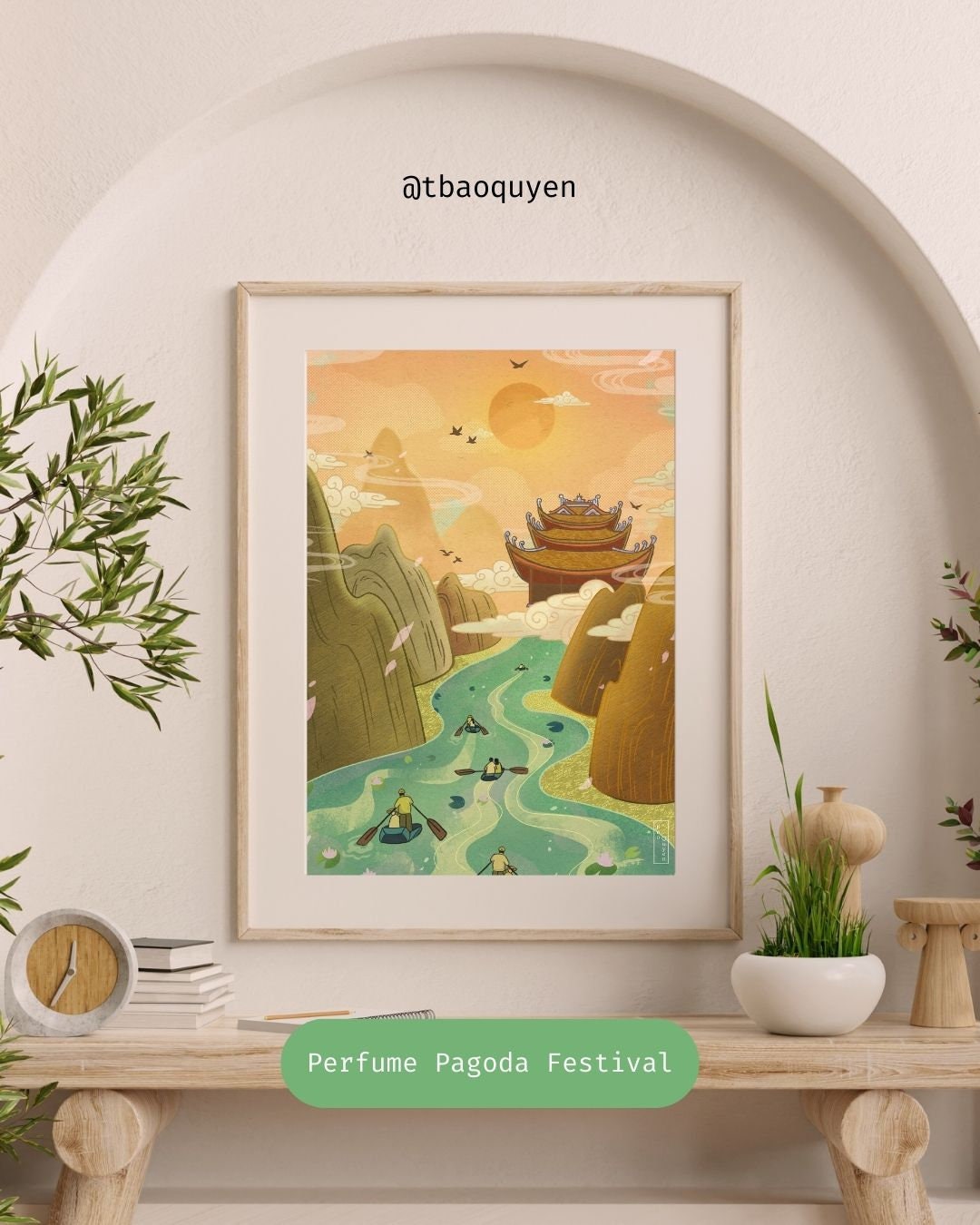 Inspired by the Perfume Pagoda Festival, this illustration reflects one of Vietnam’s most sacred spiritual events, held at the Perfume Pagoda near Hanoi. Taking place from the first to the third lunar month, the festival draws pilgrims who embark on a physically and spiritually demanding journey in search of purification, guidance, and blessings from the Goddess of Mercy.