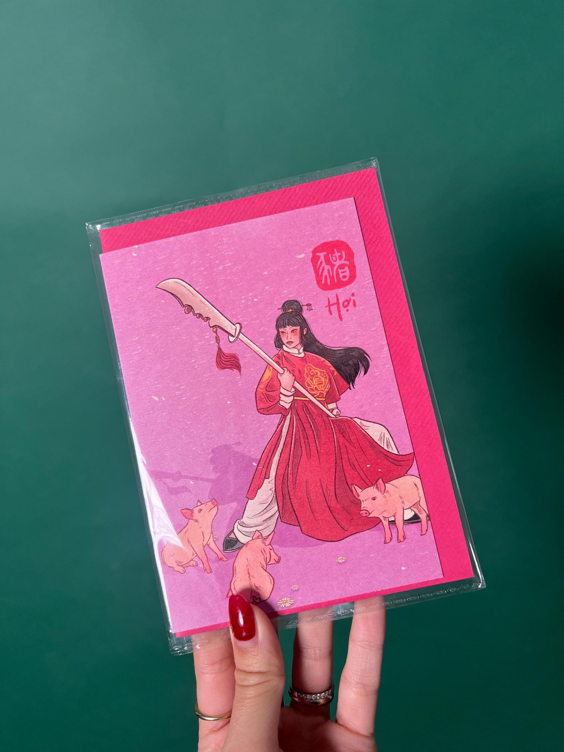 This Pig zodiac greeting card is an original illustration by Bao Quyen, printed on high-quality 320g textured paper. The card is A6 size when folded and comes with a premium, colourful textured envelope, making it perfect for gifting or collecting.