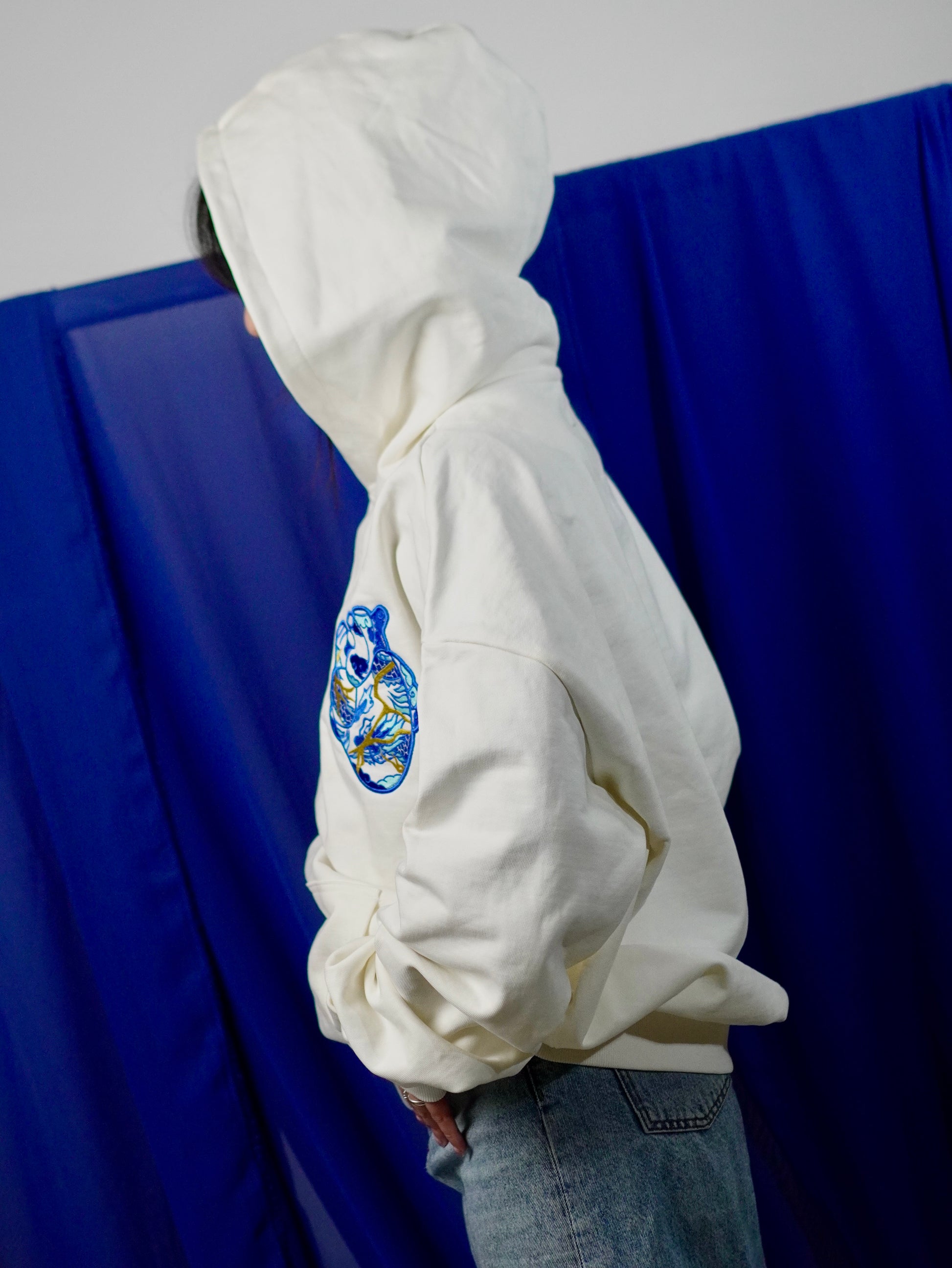 Made from ultra heavy 460 g/m² 100% cotton, the hoodie features a structured unisex oversize box fit that suits every body. The clean white base contrasts beautifully with the embroidery, creating a subtle yet powerful statement.