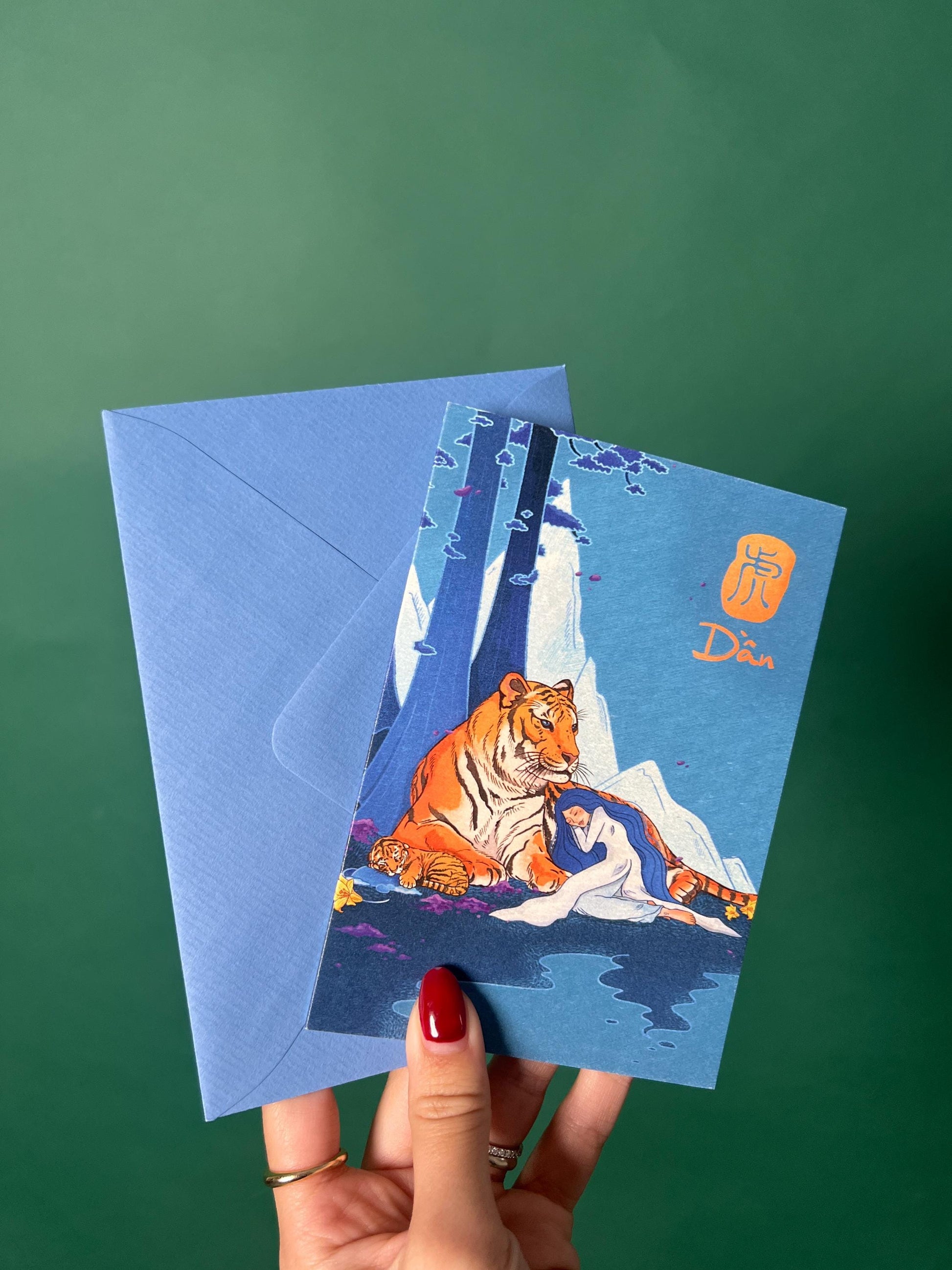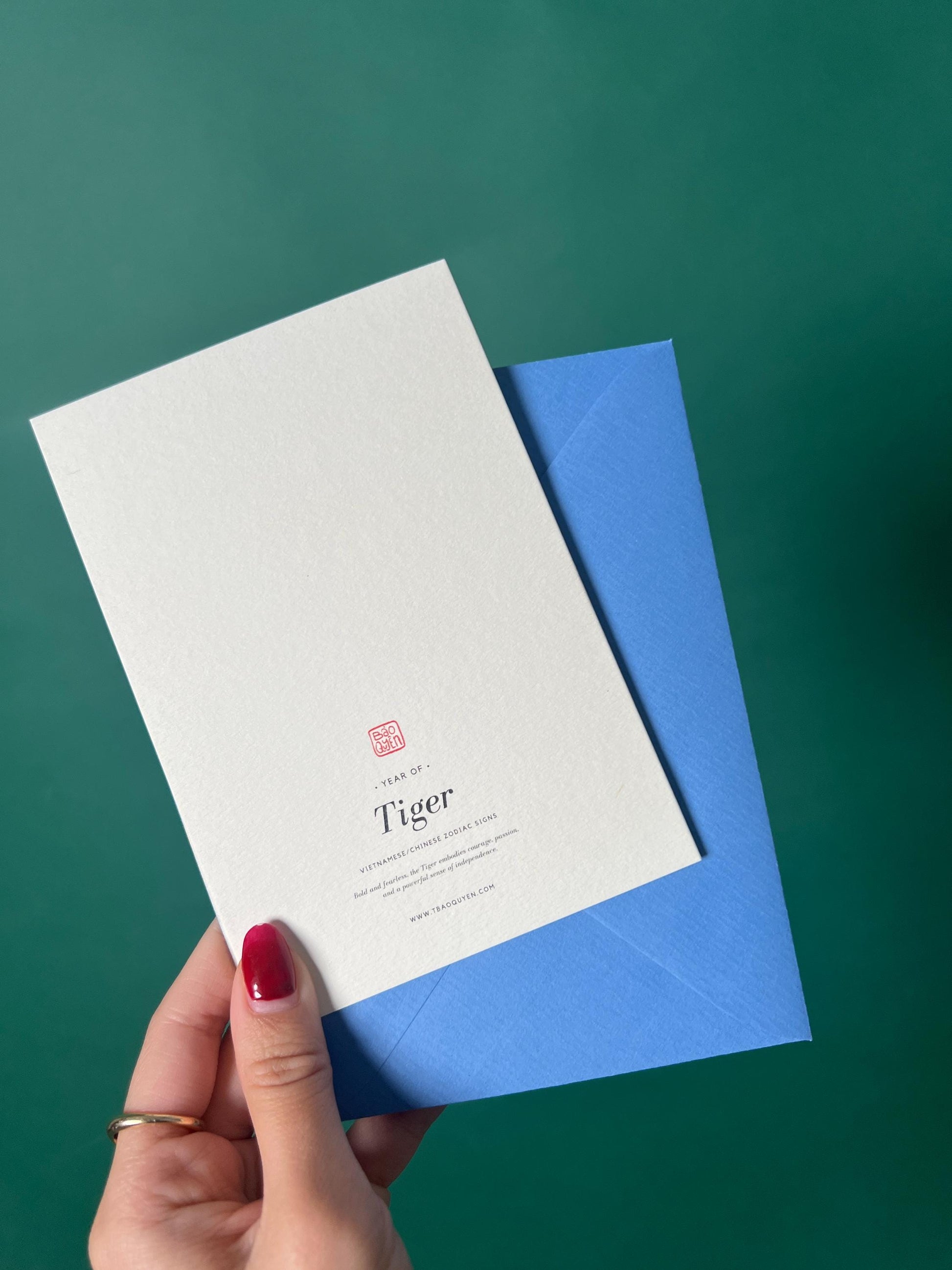 This Tiger zodiac greeting card is an original illustration by Bao Quyen, printed on high-quality 320g textured paper. The card is A6 size when folded and comes with a premium, colourful textured envelope. Please note that the color of the envelope may vary, making each card slightly unique.