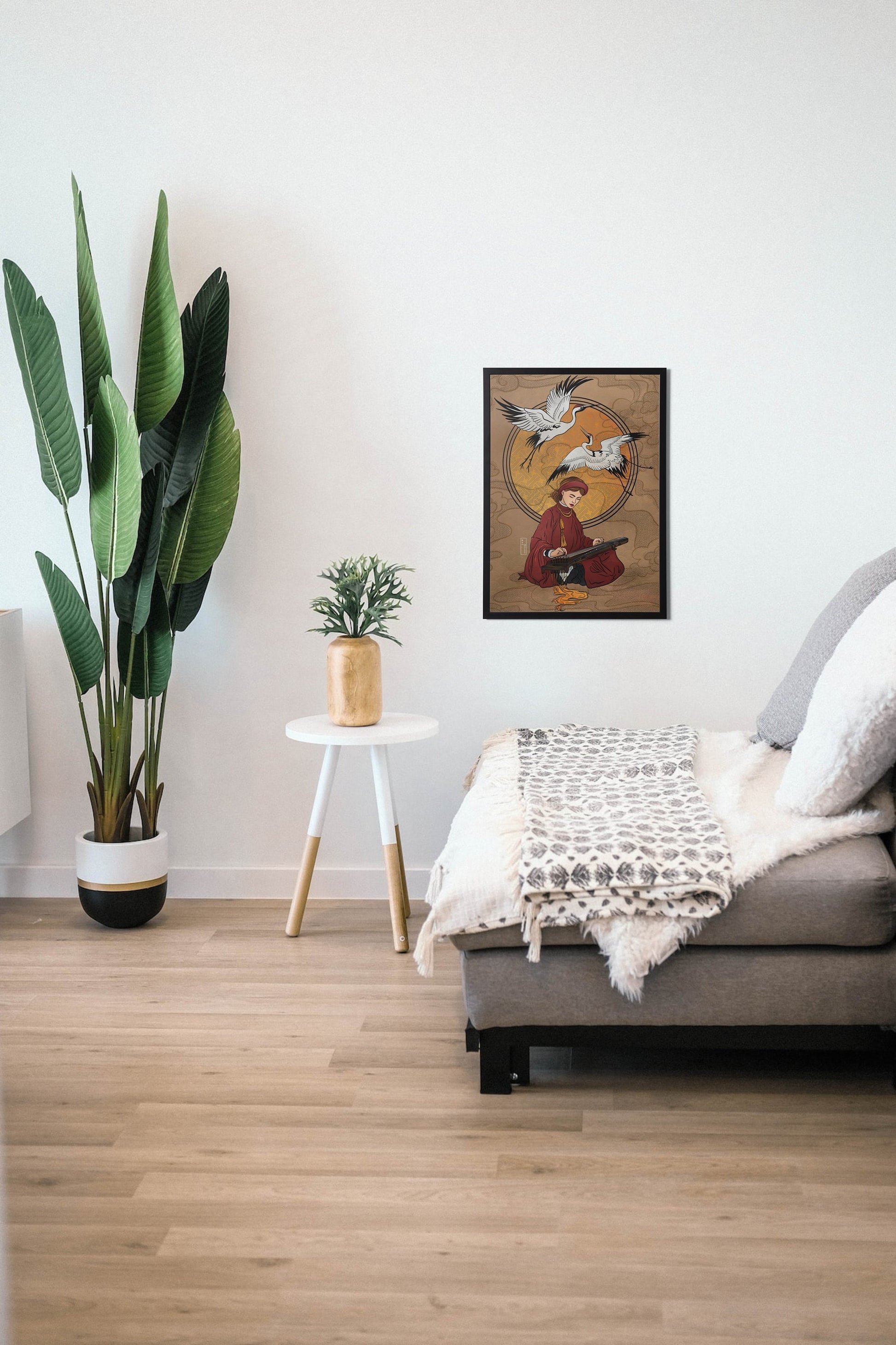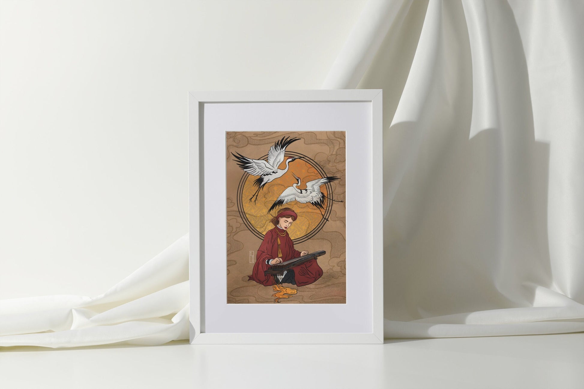 Inspired by Vietnamese culture, this illustration depicts a girl playing the guqin, a traditional string instrument associated with reflection, balance, and inner harmony. She is dressed in áo tấc, a formal Vietnamese garment historically worn by both commoners and elites, symbolizing dignity, tradition, and cultural continuity.