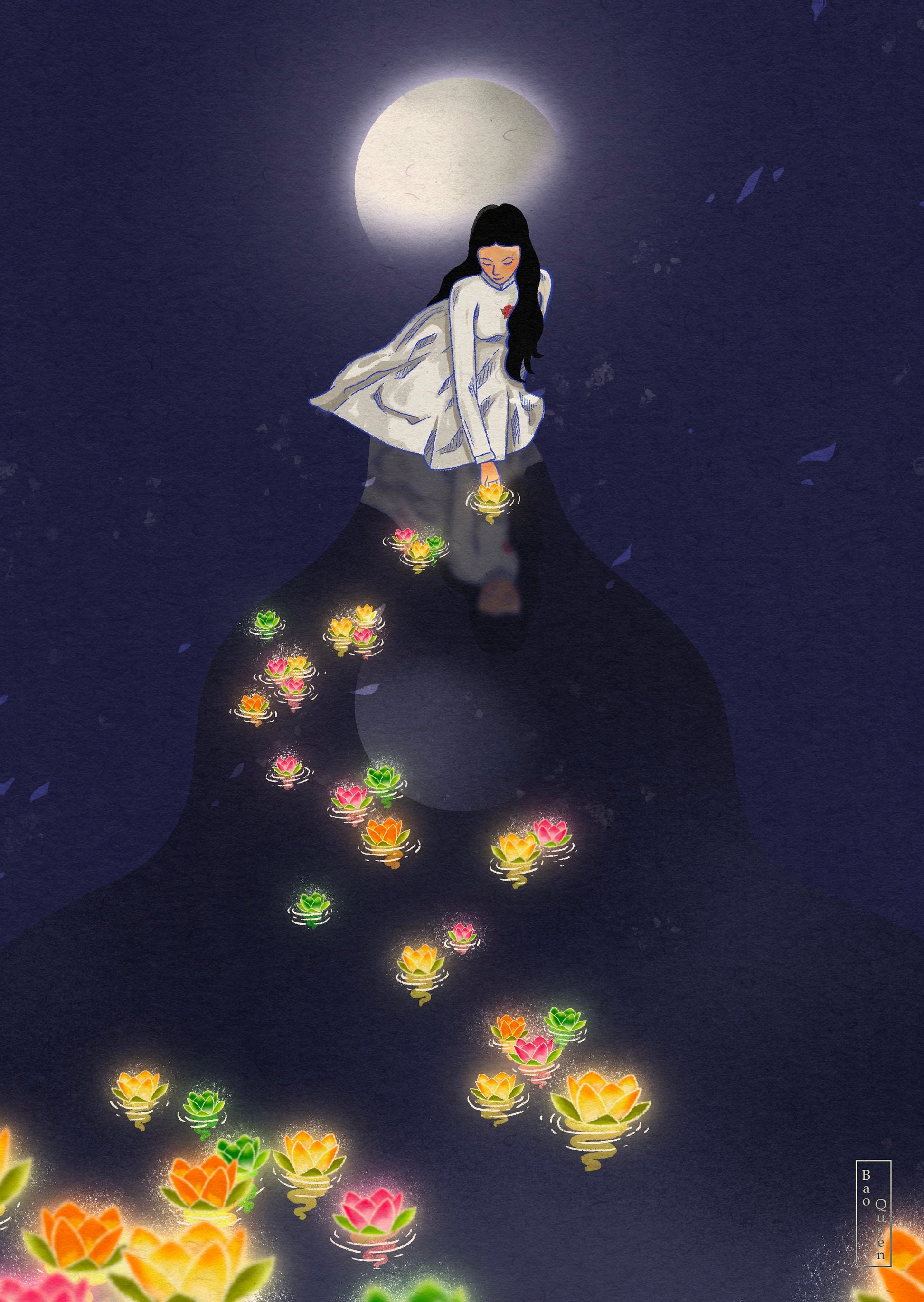 Inspired by Lễ Vu Lan, also known as the Wandering Souls Festival, this illustration honors one of Vietnam’s most meaningful spiritual celebrations. Held on the 15th day of the seventh lunar month, Lễ Vu Lan is a time to remember deceased ancestors, show gratitude to parents, and offer compassion to wandering spirits.
